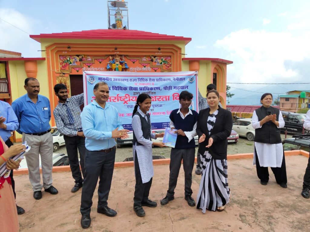 पौड़ी/श्रीनगर गढ़वाल। अंतर्राष्ट्रीय साक्षरता दिवस के अवसर पर जिला विधिक सेवा प्राधिकरण पौड़ी की ओर से सोमवार को विधिक साक्षरता एवं जागरूकता शिविर का आयोजन किया गया। शिविर की शुरुआत एजेंसी चौक से रामलीला मैदान तक रैली के आयोजन से हुई,जिसमें स्कूली छात्र-छात्राओं ने न्याय और शिक्षा दोनों हमारे अधिकार जैसे नारों के माध्यम से आमजन को जागरुक किया। रैली के उपरांत एक बच्चा-एक किताब अभियान के तहत विद्यार्थियों को पुस्तकें भी वितरित की गयी। सिविल जज सीनियर डिवीजन/सचिव जिला विधिक सेवा प्राधिकरण नाजिश कलीम ने शिविर में उपस्थित छात्र-छात्राओं को उनके मौलिक अधिकार और कर्तव्यों,बाल अधिकार,शिक्षा का महत्व तथा शिक्षा का अधिकार अधिनियम के तहत संविधान के अनुच्छेद 21(ए) की विस्तृत जानकारी दी। उन्होंने जिला विधिक सेवा प्राधिकरण अधिनियम,सरकारी योजनाओं और निशुल्क कानूनी सहायता की उपलब्धता की जानकारी भी दी। साथ ही बच्चों को डिजिटल साक्षरता और साइबर सुरक्षा से जुड़े अहम बिंदुओं के बारे में जागरूक किया।कार्यक्रम में उपस्थित सभी छात्र-छात्राओं,शिक्षकों एवं कर्मचारियों ने अंतर्राष्ट्रीय साक्षरता दिवस पर शपथ ली। इस अवसर पर जिला शिक्षा अधिकारी आर.एस.नेगी,असिस्टेंट लीगल डिफेंस काउंसिल विनोद कुमार,रिटेनर अधिवक्ता कुसुम नेगी,जिला क्रीड़ा समन्वयक योगंबर सिंह सहित विभिन्न स्कूलों के छात्र-छात्राएं उपस्थित थे।