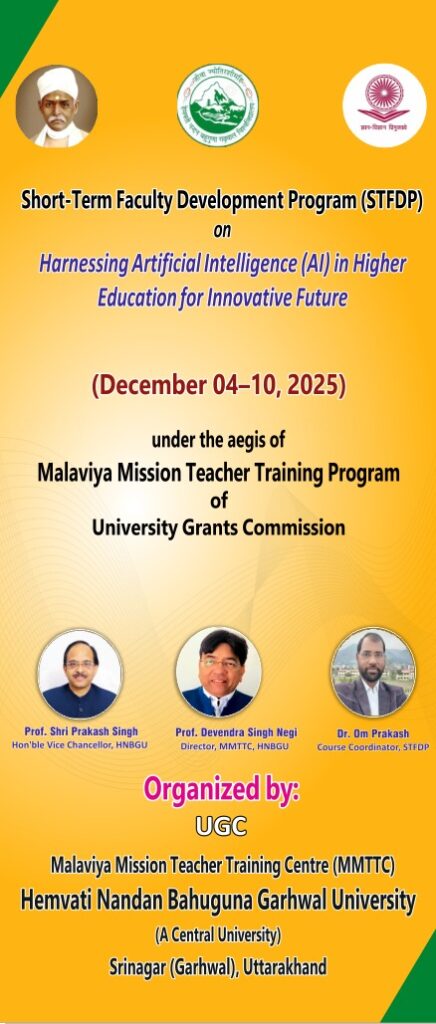 हिमालय टाइम्स गबर सिंह भण्डारी श्रीनगर गढ़वाल। हेमवती नंदन बहुगुणा गढ़वाल विश्वविद्यालय के मालवीय मिशन टीचर ट्रेनिंग सेंटर में आर्टिफिशियल इंटेलिजेंस आधारित राष्ट्रीय प्रशिक्षण कार्यक्रम का शुभारंभ कल 4 दिसंबर 2025 से होने जा