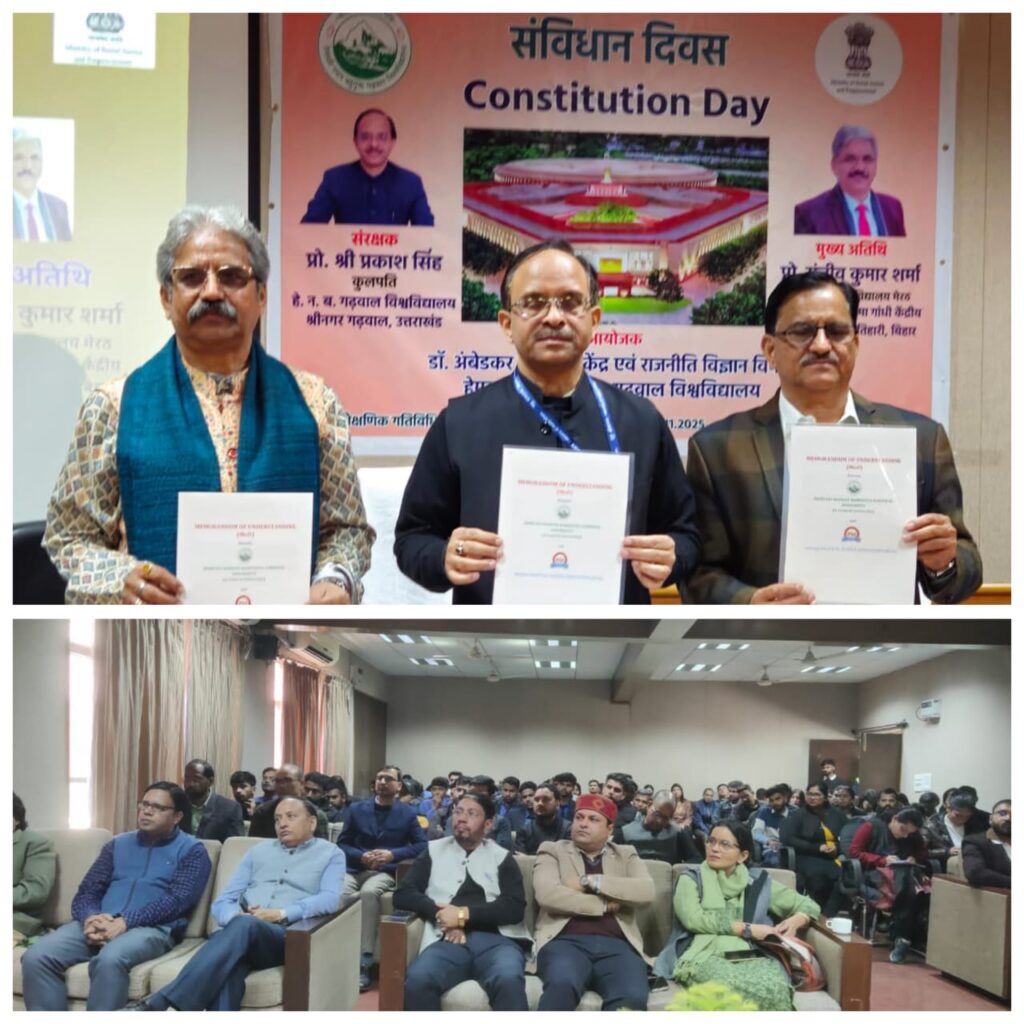 श्रीनगर गढ़वाल। हेमवती नंदन बहुगुणा गढ़वाल विश्वविद्यालय में संविधान दिवस के उपलक्ष्य में डॉ.अंबेडकर उत्कृष्टता केंद्र एवं राजनीति विज्ञान विभाग के संयुक्त तत्वावधान में एक दिवसीय विशेष कार्यक्रम का भव्य आयोजन विश्वविद्यालय के शैक्षणिक गतिविधि केंद्र में सम्पन्न हुआ। संविधान दिवस पर आयोजित यह कार्यक्रम न केवल बौद्धिक वैचारिकी का मंच बना,बल्कि भारतीय लोकतंत्र की मूल आत्मा-संविधान-की जीवटता और व्यापकता को समझने का भी अवसर प्रदान करता रहा। कार्यक्रम में विश्वविद्यालय के कुलपति प्रोफेसर श्रीप्रकाश सिंह,मुख्य अतिथि एवं मुख्य वक्ता प्रोफेसर संजीव कुमार शर्मा विभागाध्यक्ष एवं डीन चौधरी चरण सिंह विश्वविद्यालय मेरठ,अधिष्ठाता छात्र कल्याण प्रोफेसर ओ.पी.गुसाई तथा कार्यक्रम संयोजक एवं वरिष्ठ विद्वान प्रोफेसर एम.एम.सेमवाल मंचासीन रहे। परंपरागत दीप प्रज्वलन से आरम्भ हुए इस कार्यक्रम में संविधान के मूल्यों और भारतीय लोकतंत्र की आत्मा को एक नई व्याख्या प्रदान की गई। मुख्य वक्ता प्रो.संजीव कुमार शर्मा ने भारतीय संविधान की सर्वोच्चता विषय पर अपना विस्तृत व्याख्यान प्रस्तुत किया। उन्होंने कहा कि भारतीय संविधान विश्व का सबसे श्रेष्ठ,सर्वाधिक विस्तृत और सर्वाधिक समय-सापेक्ष संविधान है, जो एक जीवंत और सतत विकसित होने वाला ग्रंथ है। उन्होंने संविधान सभा की गौरवशाली यात्रा,1951 के प्रथम संशोधन तथा 76 वर्षों में संविधान की मजबूती और विश्वसनीयता पर गहन विमर्श किया। दक्षिण एशिया के कई देशों और लैटिन अमेरिका-अफ्रीका के लोकतांत्रिक अस्थिर परिवेश का उल्लेख करते हुए उन्होंने कहा कि भारत ने अपनी लोकतांत्रिक संस्थाओं को जिस मजबूती से कायम रखा है,वह विश्व समुदाय के लिए एक प्रेरणादायक उदाहरण है। उन्होंने निर्वाचन आयोग,वोट बैंक राजनीति,आपराधिकरण,विधिक निर्भरता और नागरिक जिम्मेदारी जैसे महत्वपूर्ण मुद्दों पर भी प्रतिभावान विश्लेषण प्रस्तुत किया। विश्वविद्यालय के कुलपति प्रो.श्रीप्रकाश सिंह ने संविधान दिवस को संविधान के प्रति निष्ठा व्यक्त करने का पावन अवसर बताया। उन्होंने कहा कि लोकतंत्र भारत की परंपरा का मूल तत्व है,जिसके उद्गम हमें महाभारत,रामायण और अभिज्ञान शाकुंतलम् जैसे साहित्यिक और ऐतिहासिक स्रोतों में मिलते हैं। उन्होंने छात्रों से आग्रह किया कि अधिकार और कर्तव्य दोनों एक ही सिक्के के दो पहलू हैं। दोनों का समान बोध ही सशक्त नागरिक का निर्माण करता है। अधिष्ठाता छात्र कल्याण प्रो.ओ.पी.गुसाई ने कहा कि संविधान जहां हमें अधिकार प्रदान करता है,वहीं वह हमें कर्तव्यों का पालन करने की प्रेरणा भी देता है। कार्यक्रम का एक महत्वपूर्ण क्षण तब आया जब इंडियन पॉलिटि