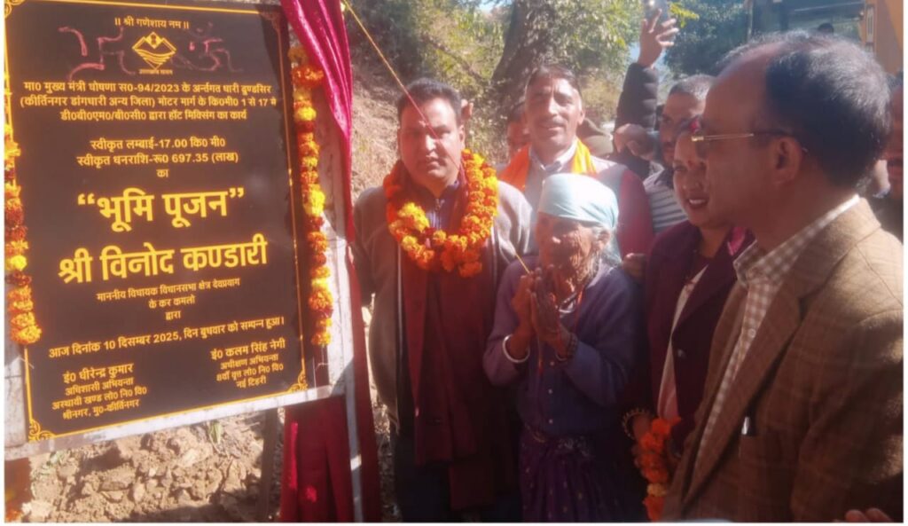 कीर्तिनगर/श्रीनगर गढ़वाल। कड़ाकोट पट्टी के हजारों ग्रामीणों के लिए आज का दिन ऐतिहासिक बन गया। लंबे समय से लंबित कीर्तिनगर-डांग धारी मोटर मार्ग के डामरीकरण एवं हॉट मिक्सिंग कार्य का विधिवत भूमि पूजन देवप्रयाग विधायक विनोद कंडारी ने किया। यह 17 किमी लंबा मार्ग 697.35 लाख रुपये की लागत से बनाया जा रहा है,जो क्षेत्र के दर्जनों गांवों को ब्लॉक मुख्यालय कीर्तिनगर से सीधा जोड़ेगा। यह परियोजना मुख्यमंत्री पुष्कर सिंह धामी की घोषणा संख्या 94/2023 के अंतर्गत स्वीकृत की गई है,जिससे क्षेत्र के ग्रामीण परिवहन और विकास को नई दिशा मिलेगी। दशकों पुरानी मांग अब साकार डांग,रणकंडियाल,कपरौली,खोलाशील धार,पायाकोटी,पारकोट,धारकोट,कोटि और थापली सहित पूरे कड़ाकोट पट्टी के ग्रामीण वर्षों से इस सड़क के डामरीकरण की मांग कर रहे थे। दुर्गम भौगोलिक परिस्थितियों और खराब मार्ग के कारण ग्रामीणों को आवाजाही,शिक्षा,स्वास्थ्य और दैनिक जरूरतों के लिए भारी दिक्कतों का सामना करना पड़ता था। भूमि पूजन के साथ ही लोगों में खुशी और उम्मीद का माहौल देखने को मिला। भूमि पूजन के बाद विधायक विनोद कंडारी ने कहा मेरी प्रतिबद्धता है कि देवप्रयाग विधानसभा के प्रत्येक गांव तक सड़क,बिजली और पानी जैसी मूलभूत सुविधाएं समयबद्ध रूप से पहुंचें। यह मोटर मार्ग कड़ाकोट पट्टी के विकास की रीढ़ साबित होगा। उन्होंने कहा कि सड़क बेहतर होने से क्षेत्र में शिक्षा,चिकित्सा और कृषि गतिविधियों में भी गति आएगी तथा युवाओं के लिए रोजगार के नए अवसर भी खुलेंगे। स्थानीय ग्रामीणों ने इस कार्य के शुभारंभ पर विधायक विनोद कंडारी और सरकार का आभार व्यक्त किया। उनका कहना है कि सड़क सुधरने से सबसे अधिक राहत स्कूली छात्रों,मरीजों और किसानों को मिलेगी। खराब मौसम में बंद रहने वाला रास्ता अब मजबूती के साथ हर मौसम में सुगम रहेगा। इस अवसर पर लोक निर्माण विभाग कीर्तिनगर के अधिशासी अभियंता धीरेंद्र कुमार,सहायक अभियंता मुनीश कुमार,ठेकेदार संतोष उनियाल,प्रधान खोला शिवराज सिंह,प्रधान कपरोली दिनेश कुमार,क्षेत्र पंचायत सदस्य पारकोट चंद्रमोहन सिंह,टिहरी जिला उपाध्यक्ष नरेन्द्र कुंवर,राम सिंह चौहान,संजीव चौहान,विजय चौहान,नेत्र सिंह,जगदीश कैंतूरा,विकास मेहरा,कुलदीप प्रकाश,अशोक उनियाल,जिला पंचायत सदस्य खोला-कड़ाकोट कविता देवी,लक्ष्मण रावत,भगवान सिंह पटवाल,दिनेश राणा सहित अनेक जनप्रतिनिधि और ग्रामीण उपस्थित रहे। इस सड़क परियोजना से कड़ाकोट पट्टी का विकास नए चरण में प्रवेश करेगा और ग्रामीण क्षेत्रों की कनेक्टिविटी में बड़ा बदलाव आने की उम्मीद है।