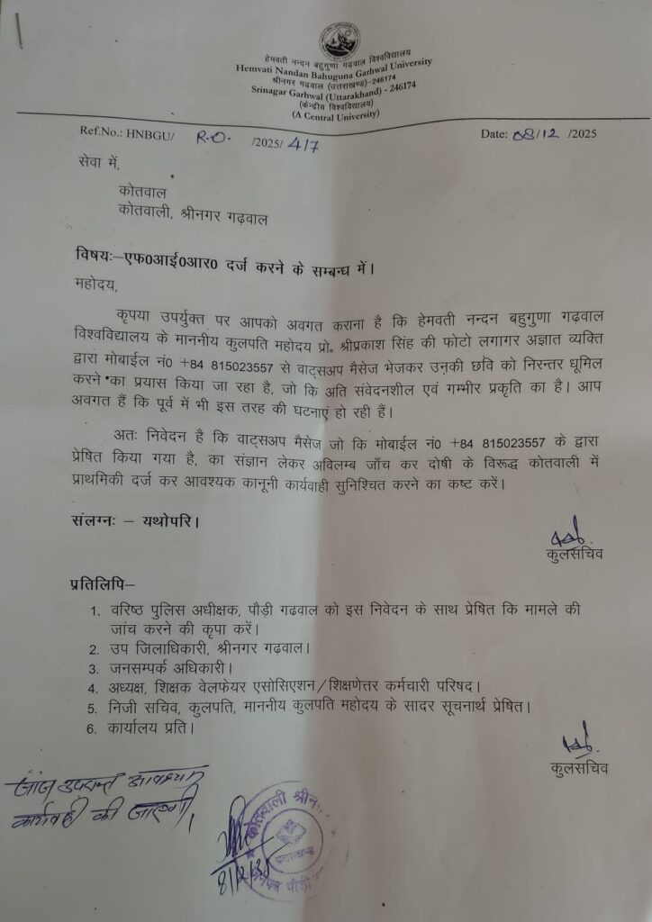 श्रीनगर गढ़वाल। हेमवती नंदन बहुगुणा गढ़वाल विश्वविद्यालय से जुड़े एक गंभीर और संवेदनशील मामले ने प्रशासन की चिंता बढ़ा दी है। विश्वविद्यालय के कुलपति प्रो.श्रीप्रकाश सिंह की फोटो का उपयोग कर अज्ञात व्यक्ति द्वारा व्हाट्सऐप पर भ्रामक संदेश भेजे जा रहे हैं। इस पर विश्वविद्यालय प्रशासन ने कड़ा संज्ञान लेते हुए श्रीनगर कोतवाली में आधिकारिक तहरीर दर्ज कराई है। कोतवाली में दी गई तहरीर में विश्वविद्यालय के कुलसचिव प्रो.राकेश कुमार ढोड़ी ने स्पष्ट कहा कि अज्ञात व्यक्ति द्वारा कुलपति प्रो.श्रीप्रकाश सिंह की फोटो लगाकर मोबाइल से व्हाट्सऐप संदेश भेजे जा रहे हैं,जिनका उद्देश्य उनकी छवि धूमिल करना और भ्रम फैलाना प्रतीत होता है। यह कृत्य अत्यंत संवेदनशील,अनुचित एवं आपराधिक प्रकृति का है। कुलसचिव ने यह भी बताया कि पूर्व में भी ऐसी घटनाएं सामने आ चुकी हैं,जिससे यह प्रतीत होता है कि किसी संगठित तरीके से कुलपति की प्रतिष्ठा को चोट पहुंचाने की कोशिश की जा रही है। विश्वविद्यालय प्रशासन ने इस अज्ञात व्यक्ति या गिरोह की पहचान कर उसके खिलाफ कड़ी,निष्पक्ष और त्वरित कार्रवाई की मांग की है। विश्वविद्यालय का कहना है कि इस प्रकार की गतिविधियां न केवल विश्वविद्यालय की छवि को नुकसान पहुंचाती हैं,बल्कि शिक्षा जगत में अनावश्यक भ्रम और अविश्वास भी पैदा करती हैं। तहरीर मिलने के बाद श्रीनगर पुलिस ने मामले को गंभीरता से लेते हुए तुरंत साइबर सेल को जांच के लिए भेज दिया है। साइबर विशेषज्ञ अब मैसेज भेजने वाले नंबर,तकनीकी लोकेशन,उपयोग किए गए प्रोफाइल और डिजिटल साक्ष्यों की जांच कर रहे हैं। अपराधी की पहचान संभवतः डिजिटल ट्रैकिंग से हो सकती है,व्हाट्सऐप चैट पैटर्न और फोटो अपलोड की टाइमलाइन की भी जांच होगी,साइबर अपराध की धाराओं के तहत कड़ी कार्रवाई की जाएगी। विश्वविद्यालय के शिक्षकों,अधिकारियों और विद्यार्थियों में इस तरह की गतिविधि को लेकर गहरा रोष है। सभी का मानना है कि किसी भी प्रतिष्ठित संस्था के प्रमुख की छवि धूमिल करने की कोशिश न सिर्फ अनैतिक है,बल्कि शिक्षा व्यवस्था पर सीधा प्रहार है। यह घटना एक बार फिर याद दिलाती है कि सोशल मीडिया प्लेटफॉर्म पर जानकारी का दुरुपयोग आज बड़ी चुनौती बन चुका है। कुलपति की फोटो लगाकर भेजे गए भ्रामक संदेश न केवल आपराधिक कृत्य हैं,बल्कि उच्च शैक्षणिक संस्थानों की गरिमा को ठेस पहुंचाने का प्रयास भी हैं। साइबर सेल की जांच का परिणाम आने वाले दिनों में इस मामले की वास्तविकता को उजागर करेगा।