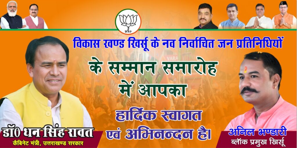 पौड़ी/श्रीनगर गढ़वाल। जनपद पौड़ी गढ़वाल के विकास खण्ड खिर्सू मुख्यालय में 24 अक्टूबर को लोकतंत्र के नये नव निर्वाचित जनप्रतिनिधियों के सम्मान में एक भव्य सम्मान समारोह का आयोजन किया जा रहा है। इस अवसर पर मुख्य अतिथि के रूप में उत्तराखण्ड सरकार के कैबिनेट मंत्री एवं क्षेत्रीय विधायक डॉ.धन सिंह रावत उपस्थित रहेंगे,जबकि कार्यक्रम की अध्यक्षता खिर्सू ब्लॉक प्रमुख अनिल भण्डारी करेंगे।