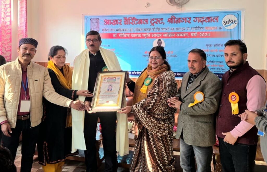 श्रीनगर गढ़़वाल। गढ़वाली भाषा,लोक साहित्य और सांस्कृतिक चेतना के संरक्षण एवं संवर्धन को समर्पित आखर चैरिटेबल ट्रस्ट द्वारा डॉ.गोविन्द चातक की जयंती के उपलक्ष्य में डॉ.गोविन्द चातक स्मृति व्याख्यान’ एवं डॉ.गोविन्द चातक स्मृति आखर साहित्य सम्मान–2024 समारोह का भव्य आयोजन सौरभ होटल श्रीकोट में गरिमामय वातावरण में सम्पन्न हुआ। इस अवसर पर गढ़़वाली नाट्य लेखन एवं रंगकर्म के माध्यम से गढ़़वाली भाषा-साहित्य में उल्लेखनीय योगदान देने हेतु उत्तराखंड के सुप्रसिद्ध गढ़वाली नाटककार एवं रंगकर्मी कुलानन्द घनशाला को डॉ.गोविन्द चातक स्मृति आखर साहित्य सम्मान-2024 से सम्मानित किया गया। सम्मान स्वरूप उन्हें 11,000 रुपए की नकद धनराशि,अंगवस्त्र,सम्मान पत्र एवं विशेष आखर स्मृति चिन्ह भेंट किया गया। सम्मान राशि डॉ.गोविन्द चातक के परिवार की ओर से प्रदान की गई। उल्लेखनीय है कि आखर ट्रस्ट विगत नौ वर्षों से निरंतर यह आयोजन करता आ रहा है। कार्यक्रम का शुभारंभ अतिथियों द्वारा दीप प्रज्वलन कर डॉ.गोविन्द चातक के चित्र पर माल्यार्पण एवं पुष्पांजलि अर्पित कर किया गया। इस अवसर पर संगीत शिक्षिका हिमानी फोंदणी द्वारा प्रस्तुत मांगल गीत ने कार्यक्रम को भावपूर्ण वातावरण प्रदान किया। अतिथियों का स्वागत आखर ट्रस्ट के संस्थापक एवं अध्यक्ष संदीप रावत ने किया। कार्यक्रम में वक्ताओं ने गढ़वाल के लोक साहित्य एवं गढ़़वाली भाषा में डॉ.गोविन्द चातक के अवदान को चिरस्मरणीय और अतुलनीय बताया तथा उनके जीवन,व्यक्तित्व और कृतित्व पर विस्तार से प्रकाश डाला। मुख्य अतिथि नगर निगम श्रीनगर की महापौर आरती भण्डारी ने आखर ट्रस्ट की इस पहल की सराहना करते हुए कहा कि डॉ.गोविन्द चातक जैसी विभूतियों को स्मरण कर प्रतिवर्ष इस प्रकार के कार्यक्रम आयोजित करना समाज और आने वाली पीढ़ी के लिए प्रेरणादायी है। कार्यक्रम की अध्यक्षता करते हुए हेमवती नंदन बहुगुणा गढ़वाल केंद्रीय विश्वविद्यालय की कला,संचार एवं भाषा संकायाध्यक्ष तथा सुप्रसिद्ध लेखिका प्रो.मंजुला राणा ने कहा कि डॉ.चातक ने गढ़वाल के लोक साहित्य को सहेजने और संरक्षित करने में जो कार्य किया,वह अद्वितीय है,परंतु उन्हें उनके जीवनकाल में अपेक्षित सम्मान नहीं मिल पाया। अति विशिष्ट अतिथि धाद पत्रिका के संपादक एवं लोक कला निष्पादन केन्द्र के निदेशक गणेश खुगशाल गणी ने कहा कि डॉ.चातक ने दूरस्थ क्षेत्रों के गांव-गांव जाकर लोकगीतों,लोकगाथाओं,जागर,पवाड़ा,चैती गीतों का संकलन कर लोक साहित्य को नई पहचान दी। उन्होंने नई पीढ़ी को डॉ.चातक के जीवन से प्रेरणा लेने का आह्वान किया। विशिष्ट अतिथि प्रो.सम्पूर्ण सिंह रावत ने कहा कि डॉ.चातक का व्यक्तित्व विराट होते हुए भी अत्यंत स