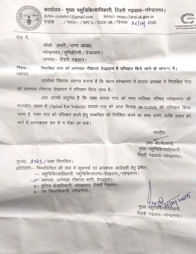 देवप्रयाग/श्रीनगर गढ़वाल। मानवता और संवेदनशीलता की मिसाल पेश करते हुए मुख्य पशु चिकित्साधिकारी टिहरी नरेंद्रनगर ने घायल गाय के उपचार एवं संरक्षण हेतु तत्काल कार्रवाई के आदेश जारी किए हैं। जारी पत्र के अनुसार नरेंद्रनगर क्षेत्र में पाई गई गंभीर रूप से घायल गाय को उचित देखभाल और चिकित्सा सहायता प्रदान करने के लिए देवप्रयाग स्थित अरुण्यक गौशाला में सुरक्षित रूप से स्थानांतरित किया जाएगा। मुख्य पशु चिकित्साधिकारी डॉ.डी.के.शर्मा द्वारा थाना प्रभारी/चौकी प्रभारी,नरेंद्रनगर-मुनिकीरेती-देवप्रयाग को भेजे गए आधिकारिक पत्र (संख्या 2043/उक्त दिनांक 26.10.2025) में स्पष्ट निर्देश दिए गए हैं कि घायल गाय को नगर पालिका परिषद नरेंद्रनगर के राजकीय वाहन (Applied For Vehicle) से देवप्रयाग स्थित अरुण्यक गौशाला पहुंचाया जाए,ताकि उसे समुचित उपचार और संरक्षण मिल सके। पत्र में यह भी उल्लेख किया गया है कि परिवहन के दौरान मार्ग में किसी प्रकार की रुकावट न हो,इसके लिए पुलिस विभाग को समुचित सहयोग प्रदान करने का अनुरोध किया गया है। साथ ही यह भी सुनिश्चित किया गया है कि गाय को स्थानांतरण के दौरान पूर्ण सावधानी और सुरक्षा के साथ ले जाया जाए,ताकि पशु को कोई अतिरिक्त कष्ट न पहुंचे। इस संबंध में पशु चिकित्साधिकारी,पशु चिकित्सालय देवप्रयाग प्रबंधक अरुण्यक गौशाला बागी देवप्रयाग,पुलिस क्षेत्राधिकारी नरेंद्रनगर और उप जिलाधिकारी नरेंद्रनगर को भी पत्र की प्रति सूचना और आवश्यक कार्रवाई हेतु भेजी गई है। मुख्य पशु चिकित्साधिकारी डॉ.डी.के.शर्मा ने कहा कि पशु संरक्षण और संवेदना हमारे विभाग की प्राथमिक जिम्मेदारी है। घायल एवं निराश्रित पशुओं को सुरक्षित आश्रय दिलाना न केवल सेवा भावना का कार्य है,बल्कि यह हमारी सामाजिक जिम्मेदारी भी है। इस निर्देश के बाद क्षेत्र में पशु प्रेमियों और सामाजिक संगठनों ने पशु चिकित्सा विभाग की तत्परता की सराहना की है। लोगों ने कहा कि ऐसे कदम न केवल संवेदनशील प्रशासन की झलक देते हैं,बल्कि गौ-संरक्षण की दिशा में प्रेरणादायक उदाहरण भी हैं।