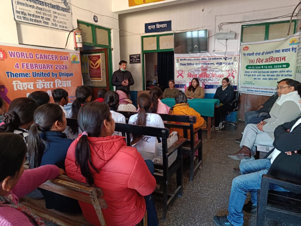 पौड़ी/श्रीनगर गढ़वाल। स्वास्थ्य विभाग पौड़ी द्वारा बुधवार को जिला विधिक सेवा प्राधिकरण की सचिव नाजिस कलीम की अध्यक्षता में विश्व कैंसर दिवस की थीम यूनाइटेड बाय यूनिक को लेकर जिला चिकित्सालय पौड़ी में जन-जागरूकता कार्यक्रम आयोजित किया गया। कार्यक्रम के दौरान चिकित्सकों ने मौजूद लोगों को कैंसर के प्रकार,लक्षण,पहचान,बचाव एवं उपचार के संबंध में विस्तृत जानकारी दी। कार्यक्रम में डॉ.शशांक उनियाल ने मुंह के कैंसर के बारे में जानकारी देते हुए बताया कि यदि मुंह में घाव एक माह बाद भी न भरे,मुंह खोलने में कठिनाई हो,चबाने या निगलने में परेशानी हो,तो यह मुंह के कैंसर के लक्षण हो सकते हैं। उन्होंने बताया कि मुंह के कैंसर का एक बड़ा कारण धूम्रपान,गुटखा,तंबाकू आदि का सेवन है। ऐसे में लोगों को इनका सेवन छोड़ना चाहिए और समय-समय पर मुंह की जांच कराते रहना चाहिए,ताकि गंभीर बीमारी की शुरुआत में ही पहचान हो सके और समय रहते उपचार शुरू किया जा सके। वहीं डॉ.अलीशा ने महिलाओं को स्तन कैंसर और गर्भाशय ग्रीवा कैंसर के बारे में जागरूक करते हुए स्वयं स्तन परीक्षण की जानकारी दी। उन्होंने बताया कि महिलाएं नियमित जांच के माध्यम से प्रारंभिक स्तर पर स्तन कैंसर की संभावना की पहचान कर सकती हैं। इस अवसर पर सचिव जिला विधिक सेवा प्राधिकरण नाजिस कलीम ने कहा कि पहले कैंसर को लेकर लोगों में भय रहता था और इस विषय पर खुलकर बात नहीं होती थी। लेकिन अब चिकित्सा क्षेत्र में निरंतर शोध जारी है और समय से कैंसर का पता चल जाए तो उपचार संभव है। उन्होंने कहा कि विश्व कैंसर दिवस मनाने का उद्देश्य लोगों में कैंसर जैसी घातक बीमारी को लेकर जागरूकता बढ़ाना है। वर्तमान समय में खानपान,रहन-सहन और दूषित वातावरण के कारण कैंसर के मामलों में तेजी से वृद्धि हो रही है,इसलिए समय-समय पर जांच कराना जरूरी है। उन्होंने कहा कि जागरूकता अभियानों की सफलता के लिए जनसहभागिता अत्यंत आवश्यक है। कार्यक्रम में अपर मुख्य चिकित्सा अधिकारी डॉ.पारुल गोयल ने कहा कि कैंसर देश ही नहीं बल्कि विश्व स्तर पर बड़ी समस्या बन चुका है। उन्होंने बताया कि 30 से 69 वर्ष आयु वर्ग के लोगों में कैंसर का खतरा अधिक रहता है। उन्होंने बताया कि विश्व कैंसर दिवस के अवसर पर भारत सरकार द्वारा राष्ट्रीय स्वास्थ्य मिशन के तहत चलाए जा रहे 100 दिवसीय गैर संचारी रोग रोकथाम एवं बचाव अभियान का शुभारंभ किया गया है,जो आज से 14 मई 2026 तक चलेगा। अभियान के तहत जनपद के सभी आयुष्मान आरोग्य मंदिरों में निःशुल्क रक्तचाप,शुगर,मुंह के कैंसर,गर्भाशय एवं स्तन कैंसर की स्क्रीनिंग तथा संदर्भन सुविधा उपलब्ध कराई जाएगी। उन्होंने लोगों से तंबाकू और शराब से दूर रहने तथा नियमित स्क्रीनिंग कराने की अपील 