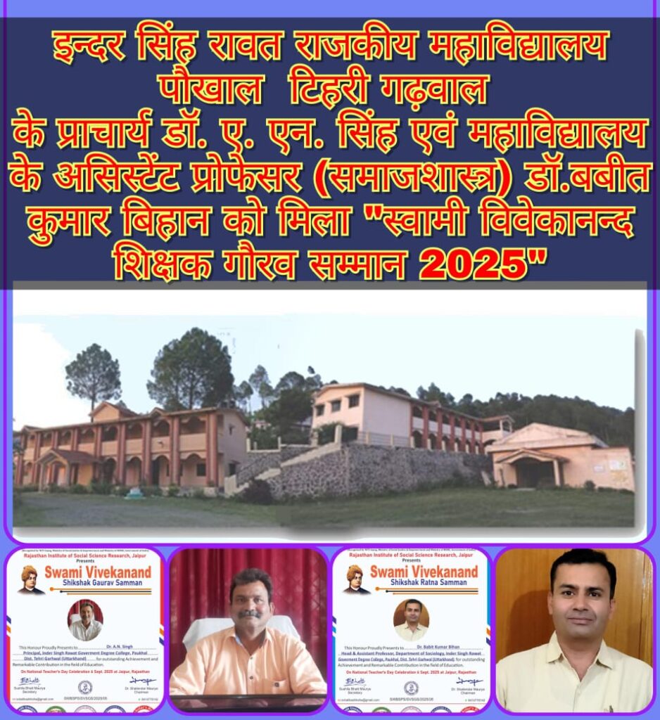 राजकीय महाविद्यालय पौखाल को दोहरी उपलब्धि प्राचार्य डॉ.ए.एन.सिंह और डॉ.बबीत कुमार बिहान को मिला स्वामी विवेकानन्द शिक्षक गौरव सम्मान -2025