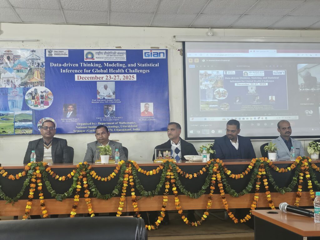 श्रीनगर गढ़वाल। राष्ट्रीय प्रौद्योगिकी संस्थान (एनआईटी) उत्तराखंड के गणित विभाग द्वारा वैश्विक स्वास्थ्य चुनौतियों के लिए डेटा-आधारित चिंतन,मॉडलिंग एवं सांख्यिकीय निष्कर्षण (GIAN–2412089) शीर्षक से पांच दिवसीय ग्लोबल इनिशिएटिव ऑफ एकेडमिक नेटवर्क्स (GIAN) पाठ्यक्रम का आज विधिवत शुभारंभ हुआ। यह प्रतिष्ठित GIAN पाठ्यक्रम भारत सरकार के शिक्षा मंत्रालय द्वारा प्रदान किए गए लगभग 6.6 लाख रुपए के अनुदान से 23 से 27 दिसंबर 2025 तक संचालित किया जाएगा,जिसका उद्देश्य अंतरराष्ट्रीय अकादमिक सहयोग को बढ़ावा देना तथा भारतीय छात्रों और शोधकर्ताओं को वैश्विक स्तर की विशेषज्ञता से जोड़ना है। उद्घाटन समारोह के मुख्य अतिथि प्रो.के.के.शुक्ल निदेशक एमएएनआईटी भोपाल एवं एनआईटी उत्तराखंड रहे। समारोह में विशिष्ट अतिथि एवं विदेशी विशेषज्ञ के रूप में डॉ.अनुज मुबायी,फैकल्टी,साउथ माउंटेन कम्युनिटी कॉलेज,फीनिक्स अमेरिका तथा फेलो-इन-रेजिडेंस,इंटरकॉलेजिएट बायोमैथमेटिक्स एलायंस अमेरिका उपस्थित रहे। अपने उद्घाटन संबोधन में प्रो.के.के.शुक्ल ने गणित विभाग को इस महत्वपूर्ण एवं सम-सामयिक पाठ्यक्रम के आयोजन के लिए बधाई दी। उन्होंने कहा कि डेटा-आधारित अनुसंधान,गणितीय मॉडलिंग और सांख्यिकीय विश्लेषण आज वैश्विक स्वास्थ्य समस्याओं के समाधान में निर्णायक भूमिका निभा रहे हैं। उन्होंने विदेशी विशेषज्ञ का स्वागत करते हुए कहा कि इस प्रकार के अंतरराष्ट्रीय पाठ्यक्रम संस्थान की अकादमिक प्रतिष्ठा को और सुदृढ़ करते हैं। विदेशी विशेषज्ञ डॉ.अनुज मुबायी ने अपने संबोधन में पाठ्यक्रम की रूपरेखा प्रस्तुत करते हुए बताया कि यह कार्यक्रम प्रतिभागियों को गणितीय मॉडलिंग,सांख्यिकीय महामारी विज्ञान,डेटा एनालिटिक्स,कृत्रिम बुद्धिमत्ता (AI) एवं मशीन लर्निंग जैसे आधुनिक उपकरणों से परिचित कराएगा। उन्होंने कहा कि पाठ्यक्रम में संक्रामक रोग संचरण मॉडलिंग,स्वास्थ्य भार आकलन,स्थानिक एवं सामाजिक महामारी विज्ञान,होस्ट-पैथोजन अंतःक्रियाएं,स्वास्थ्य अर्थशास्त्र एवं निर्णय-निर्माण ढांचे जैसे विषयों को शामिल किया गया है। गणित विभाग में एनआईटी उत्तराखंड की ओर से प्रतिभागियों का स्वागत करते हुए पाठ्यक्रम समन्वयक डॉ.धर्मेंद्र त्रिपाठी ने पोस्ट-कोविड-19 युग में इस पाठ्यक्रम की प्रासंगिकता पर प्रकाश डाला। उन्होंने वैश्विक स्वास्थ्य चुनौतियों को समझने,उनके प्रबंधन और न्यूनीकरण में डेटा,गणितीय मॉडलिंग और सांख्यिकीय निष्कर्षण की महत्वपूर्ण भूमिका को रेखांकित किया। सह पाठ्यक्रम समन्वयक के रूप में डॉ.शशांक भातरा ने स्थानीय स्तर पर कार्यक्रम के सुचारु संचालन में महत्वपूर्ण भूमिका निभाई। इस पाठ्यक्रम के लिए देशभर के आईआई