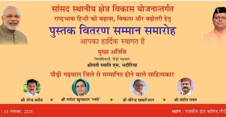 पौड़ी/श्रीनगर गढ़वाल। राष्ट्रभाषा हिन्दी एवं हिन्दी साहित्य के प्रचार-प्रसार के उद्देश्य से पौड़ी जनपद में एक ऐतिहासिक पहल की जा रही है। पूर्व मुख्यमंत्री एवं पूर्व सांसद तीरथ सिंह रावत की अनुशंसा पर सांसद स्थानीय क्षेत्र विकास योजनान्तर्गत पौड़ी जनपद के 50 इंटर कॉलेजों को पचास हजार रुपये मूल्य की हिन्दी साहित्य से जुड़ी पुस्तकों का निःशुल्क वितरण किया जाएगा। यह भव्य पुस्तक वितरण एवं सम्मान समारोह आगामी 3 नवम्बर 2025 को प्रात-11 बजे राजकीय इंटर कॉलेज पौड़ी गढ़वाल के सभागार में आयोजित होगा। कार्यक्रम की मुख्य अतिथि जिलाधिकारी स्वाति एस.भदौरिया होंगी। वहीं विशिष्ट अतिथियों में मुख्य विकास अधिकारी गिरीश गुणवंत,परियोजना निदेशक विवेक कुमार उपाध्याय शामिल रहेंगे। कार्यक्रम का उद्घाटन मुख्य अतिथि द्वारा किया जाएगा। समारोह का सबसे खास आकर्षण पौड़ी जनपद के चार प्रतिष्ठित साहित्यकारों का सम्मान होगा,जिन्हें प्रशस्ति-पत्र,पुस्तकें एवं शॉल प्रदान किए जाएंगे। सम्मानित होने वाले साहित्यकार हैं-नरेन्द्र सिंह कठैत,गणेश खुगशाल गणी,वीरेन्द्र खंकरियाल और संदीप रावत। इन साहित्यकारों ने हिन्दी भाषा और गढ़वाली संस्कृति के संवर्धन में अमूल्य योगदान दिया है। पूर्व सांसद तीरथ सिंह रावत की इस दूरदर्शी योजना से पौड़ी जिले के 50 इंटर कॉलेजों में हिन्दी साहित्य की मिनी लाइब्रेरी स्थापित की जाएगी,जिनमें हिन्दी के महान लेखकों की रचनाएं और अमूल्य कृतियां सम्मिलित होंगी। यह पहल विद्यार्थियों में हिन्दी भाषा,साहित्य और अध्ययन संस्कृति के प्रति रुचि बढ़ाने में मील का पत्थर साबित होगी। इस योजना में जिला ग्राम्य विकास अभिकरण पौड़ी गढ़वाल एवं मुख्य शिक्षा अधिकारी कार्यालय पौड़ी गढ़वाल की विशेष भूमिका रही है। कार्यक्रम में सुबह 10 बजे से शाम 5 बजे तक सभी प्रतिभागियों को सम्मान पत्र प्रदान किए जाएंगे,जिसके पश्चात पुस्तकों का वितरण किया जाएगा। इस योजना के अंतर्गत पौड़ी जनपद के विभिन्न विकास खण्डों-पाबों 11,पौड़ी 2,कोट 14,खिर्सू 9,कल्जीखाल 9,एकेश्वर 5 के कुल 50 राजकीय इंटर कॉलेजों को पुस्तकें वितरित की जाएंगी। इनमें प्रमुख विद्यालय हैं-राजकीय इण्टर कॉलेज बिडोली,बिशल्ड,चम्पेश्वर,चिपलघाट,चोपड़ियूं,गड़िगांव,ग्वालखुड़ा,जगतेश्वर,कालौं,सांकरसैंण,सीकू,पौड़ी नगर,क्यार्क,कोट,मुछियाली,घिण्डवाड़ा,खंदूखाल,देहलचौंरी,कमलपुर,दोन्दल,नाहसैंण,खोलाचौंरी,देवप्रयाग,बहेड़ाखाल,मसाणगांव,सबधारखाल,कण्डीवट,नवाखाल,दिखोल्यूं,कठूली,मरखोड़ा,सुमाड़ी,देवलगढ़,चोपड़ा,खण्डाह,स्वीत,कल्जीखाल,साकिनखेत,पुरियाडांग,काण्डा,मुण्डनेश्वर,मवाधार,नलई,दिउसी,बड़खोलू,रीठाखाल,कुलासू,बग्याली,मासौं और मैटाकुण्ड आदि। 