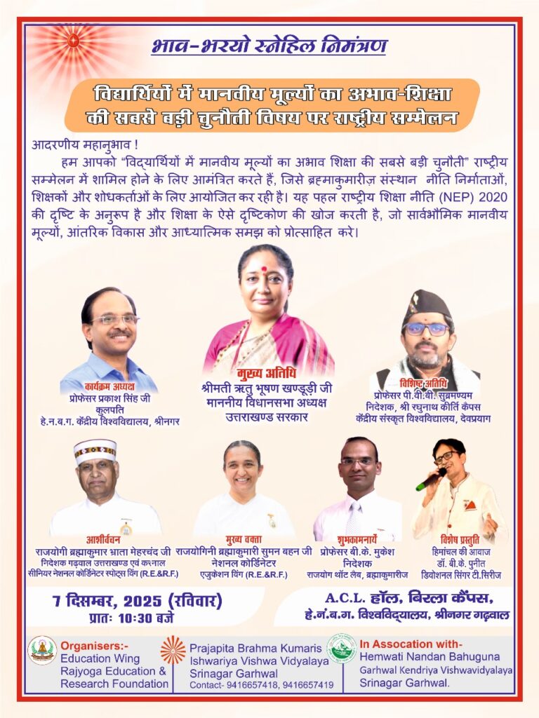 श्रीनगर गढ़वाल। नई पीढ़ी में घटते मानवीय मूल्यों को देश की सबसे बड़ी शैक्षिक चुनौती मानते हुए ब्रह्माकुमारिज शिक्षा प्रभाग तथा राजयोग शिक्षा एवं शोध संस्था द्वारा एक भव्य राष्ट्रीय सम्मेलन का आयोजन किया जा रहा है। यह महत्वपूर्ण आयोजन 7 दिसम्बर 2025 रविवार प्रात-10.30 बजे श्रीनगर स्थित हेमवती नंदन बहुगुणा गढ़वाल विश्वविद्यालय के बिरला परिसर स्थित एसीएल सभागार में संपन्न होगा। यह सम्मेलन राष्ट्रीय शिक्षा नीति 2020 के परिप्रेक्ष्य में विद्यार्थियों के आंतरिक विकास,चरित्र निर्माण और मानवीय संवेदनाओं को पुनर्जीवित करने की दृष्टि से विशेष महत्व रखता है। सम्मेलन में देश की प्रतिष्ठित हस्तियों की उपस्थिति शिक्षा और आध्यात्मिक जगत का अद्वितीय संगम जिसमें मुख्य अतिथि-ऋतु भूषण खण्डूड़ी विधानसभा अध्यक्ष उत्तराखंड सरकार। कार्यक्रम अध्यक्ष-प्रोफेसर श्रीप्रकाश सिंह कुलपति हेमवती नंदन बहुगुणा गढ़वाल केंद्रीय विश्वविद्यालय श्रीनगर,विशिष्ट अतिथि-प्रोफेसर पी.वी.बी.सुब्रमण्यम निदेशक केंद्रीय संस्कृत विश्वविद्यालय देवप्रयाग,आशीर्वचन-राजयोगी ब्रह्माकुमार भ्राता मेहरचंद निदेशक ब्रह्माकुमारिज गढ़वाल उत्तराखंड। मुख्य वक्ता-राजयोगिनी ब्रह्माकुमारी सुमन बहन राष्ट्रीय संयोजक शिक्षा प्रभाग (राजयोग शिक्षा एवं शोध संस्था),प्रोफेसर बी.के.मुकेश निदेशक राजयोग विचार प्रयोगशाला ब्रह्माकुमारिज। गायन प्रस्तुति-डॉ.बी.के.पुनीत हिमाचल प्रदेश के सुप्रसिद्ध भक्ति गीत गायक (टी-सीरीज़)। इस राष्ट्रीय सम्मेलन का प्रमुख लक्ष्य विद्यार्थियों के व्यवहार में मानवीय मूल्यों का संवर्धन,शिक्षा को केवल रोजगार का साधन नहीं,बल्कि चरित्र निर्माण का आधार बनाना,शिक्षा नीति 2020 के अनुरूप मूल्याधारित शिक्षा को प्रोत्साहित करना,शिक्षा विशेषज्ञों,नीति निर्माताओं और विद्यार्थियों को एक मंच पर लाना। आयोजक संस्था का मानना है कि यदि शिक्षा में मूल्य आधारित दृष्टि को स्थापित किया जाए,तो आने वाली पीढ़ी संवेदनशील,जागरूक और सशक्त बन सकती है। ब्रह्माकुमारिज शिक्षा प्रभाग ने समाज के सभी वर्गों से इस प्रेरणादायी आयोजन में सम्मिलित होने का आग्रह किया है। यह सम्मेलन केवल ज्ञान का मंच नहीं,बल्कि आत्मचिंतन,प्रेरणा और आध्यात्मिक जागरण का अनुपम अवसर होगा। इस महत्वपूर्ण आयोजन में अवश्य उपस्थित होकर मानवीय मूल्यों के पुनर्जागरण का भागीदार बनें।