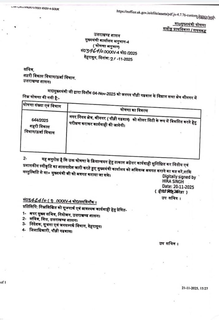 श्रीनगर गढ़वाल। अलकनंदा तट पर स्थित श्रीनगर शहर के लिए आज का दिन ऐतिहासिक साबित हुआ है। बैकुंठ चतुर्दशी मेले के दौरान मुख्यमंत्री पुष्कर सिंह धामी द्वारा की गई बहुप्रतीक्षित घोषणा अब वास्तविक रूप लेती नजर आ रही है। राज्य सरकार ने श्रीनगर को सोलर सिटी के रूप में विकसित करने संबंधी आदेश जारी कर दिए हैं,जिसके साथ ही ऊर्जा आत्मनिर्भर श्रीनगर के सपने को पंख लग गए हैं। नगर निगम श्रीनगर की महापौर आरती भण्डारी ने मुख्यमंत्री धामी के निर्णय को दूरदर्शी और ऐतिहासिक बताते हुए कहा कि मुख्यमंत्री ने श्रीनगर के भविष्य को उज्ज्वल बनाने की जो पहल की है,उसके लिए शहर की जनता की ओर से उनका हृदय से धन्यवाद। सोलर सिटी घोषणा का क्रियान्वयन शुरू होना हम सबके लिए गौरव और खुशी का क्षण है। यह परियोजना न केवल बिजली बिलों को कम करेगी,बल्कि श्रीनगर को पर्यावरणीय दृष्टि से सुरक्षित और उन्नत बनाएगी। उन्होंने बताया कि आने वाले वर्षों में श्रीनगर एक राष्ट्रीय आदर्श सोलर मॉडल के रूप में उभरेगा,जहां स्वच्छ ऊर्जा,तकनीक और पर्यावरण संरक्षण का अनूठा संगम दिखेगा। श्रीनगर-ऊर्जा आत्मनिर्भरता की ओर पहला बड़ा कदम-सोलर सिटी परियोजना लागू होने के बाद शहर की बड़ी हिस्सेदारी सौर ऊर्जा से पूरी की जाएगी। नगर निगम की शुरुआती योजना में शामिल हैं सभी सार्वजनिक भवनों पर सोलर पैनल,स्ट्रीट लाइटों का पूर्ण सौर ऊर्जा आधारित ढांचा,पार्कों,शैक्षणिक संस्थानों और निगम सेवाओं में ग्रीन एनर्जी उपयोग,शहर में घरेलू सोलर सिस्टम को बढ़ावा देने के लिए विशेष प्रोत्साहन। अधिकारियों के अनुसार इससे न केवल बिजली खर्च में भारी कमी आएगी बल्कि कार्बन उत्सर्जन घटाकर पर्यावरण संरक्षण को भी नई दिशा मिलेगी। शहरवासियों में उत्साह-श्रीनगर अब बनेगा हरित विकास का केंद्र,सरकारी आदेश जारी होने की खबर के बाद श्रीनगर में खुशी का माहौल है। व्यापारी,छात्र,पर्यावरण प्रेमी और स्थानीय नागरिक इस निर्णय को शहर के विकास की दिशा में मील का पत्थर बता रहे हैं। लोगों का मानना है कि सोलर सिटी बनने के बाद श्रीनगर उत्तराखंड का पहला ऐसा नगर होगा जो ऊर्जा समाधान,हरित विकास और अभिनव योजनाओं के लिए पूरे देश में उदाहरण स्थापित करेगा। मेयर भंडारी ने विश्वास जताया कि सरकार नगर निगम और जनता तीनों के सामूहिक प्रयास से श्रीनगर बहुत जल्द सोलर सिटी से सस्टेनेबल मॉडल सिटी के रूप में पहचाना जाएगा। श्रीनगर में सौर ऊर्जा क्रांति की शुरुआत हो चुकी है-अब शहर का भविष्य उजाले की नई दिशा में कदम बढ़ा रहा है।