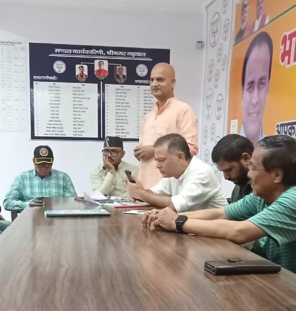 श्रीनगर गढ़वाल। सेवा पखवाड़ा के अंतर्गत 20 सितंबर को आयोजित होने वाले प्रबुद्धजन सम्मेलन तथा 21 सितंबर को होने वाली नमो मैराथन को सफल बनाने के उद्देश्य से भाजपा श्रीनगर मंडल कार्यालय में आज एक अहम बैठक आयोजित की गई। बैठक में पौड़ी जिले के भाजपा जिला महामंत्री गणेश भट्ट ने कल होने वाले प्रबुद्धजन सम्मेलन को सफल बनाने हेतु अपने विचार साझा किए। वहीं भाजपा युवा मोर्चा के प्रदेश उपाध्यक्ष डॉ.सुधीर जोशी ने नमो मैराथन के सफल आयोजन पर विस्तार से चर्चा की। उन्होंने कार्यकर्ताओं को बताया कि यह मैराथन 21 सितंबर को सुबह 6 बजे से प्रारंभ होगी,जिसके लिए सभी को सक्रिय भूमिका निभानी होगी। मंडल अध्यक्ष विनय घिल्डियाल ने बैठक में जानकारी देते हुए बताया कि नमो मैराथन के बाद कमलेश्वर मंदिर में सफाई अभियान चलाया जाएगा तथा उसके तुरंत बाद स्वास्थ्य शिविर रोडवेज बस अड्डा श्रीनगर में आयोजित होगा। बैठक में मुख्य रूप से गणेश भट्ट,विनय घिल्डियाल,सुधीर जोशी,श्रीनगर व्यापार सभा अध्यक्ष दिनेश असवाल,प्रकाश सती मंडल मीडिया प्रभारी,मीना असवाल,उषा कंडारी,राजी पूरी,दिनेश उनियाल,शुभम प्रभाकर,दिनेश पटवाल,पिंकी शाह,रेखा रावत,रेनू सुंदर्याल,पंकज रावत,सुनीता गैरोला सहित अनेक कार्यकर्ता उपस्थित रहे।