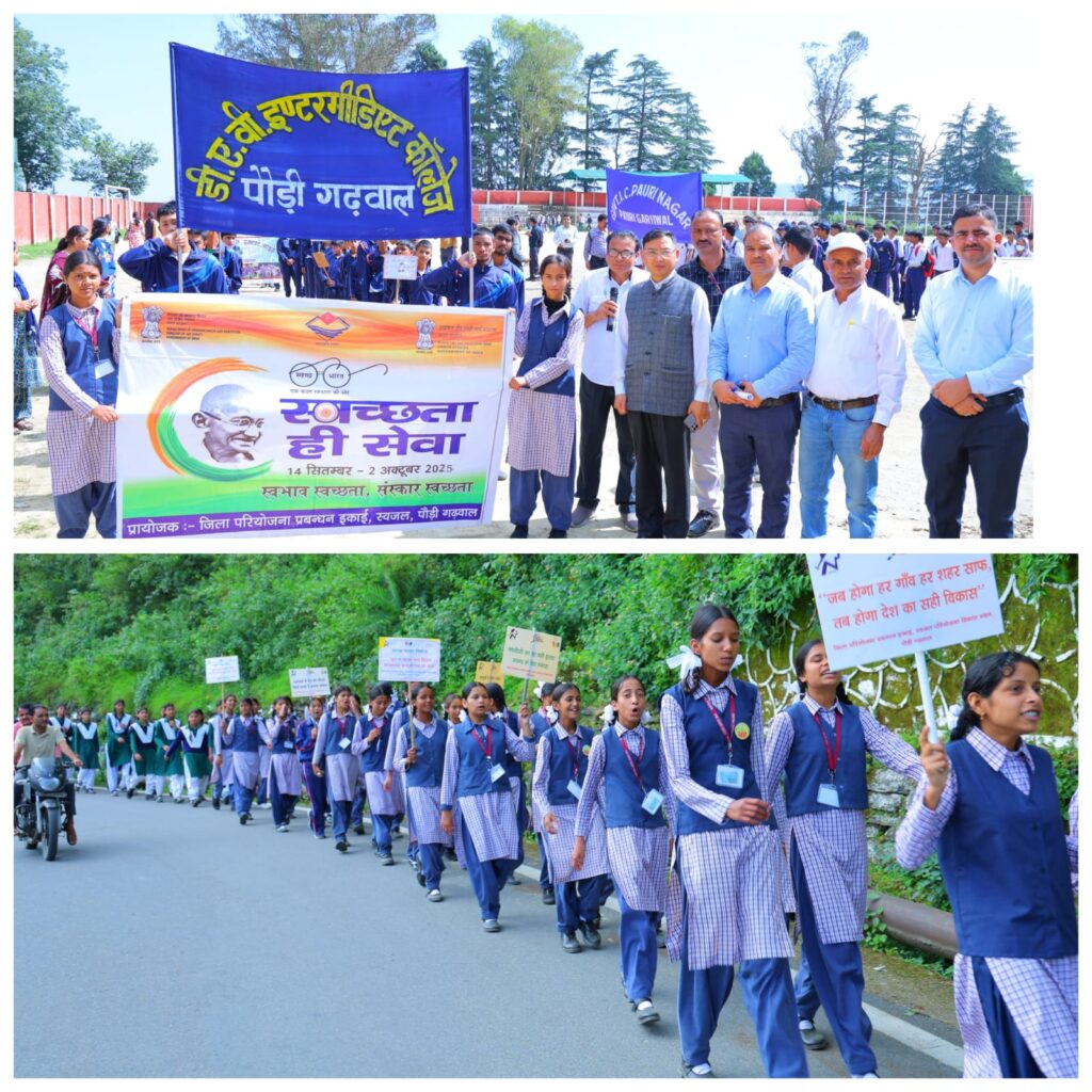 पौड़ी/श्रीनगर गढ़वाल। स्वच्छता ही सेवा पखवाड़े के अंतर्गत आज जनपद मुख्यालय पौड़ी में कंडोलिया मैदान से रामलीला मैदान तक स्वच्छता रैली का आयोजन उत्साहपूर्ण माहौल में किया गया। प्रातः10 बजे कंडोलिया मैदान में स्कूली छात्र-छात्राओं,अधिकारी-कर्मचारियों एवं जनप्रतिनिधियों ने एक विशाल मानव श्रृंखला बनाकर स्वच्छता का संदेश दिया। अपर जिलाधिकारी अनिल गर्ब्याल ने उपस्थित छात्र-छात्राओं,अधिकारियों एवं कर्मचारियों को स्वच्छता की शपथ दिलायी। उन्होंने कहा कि स्वच्छता केवल एक अभियान नहीं,बल्कि समाज और आने वाली पीढ़ियों के लिए जीवन शैली बननी चाहिए। कार्यक्रम के दौरान रैली कंडोलिया मैदान से प्रारंभ होकर बस स्टेशन,कलेक्ट्रेट होते हुए रामलीला मैदान तक पहुंची। रैली में छात्र-छात्राओं ने हाथों में तख्तियां लेकर स्वच्छता ही सेवा और स्वच्छ रहो,स्वस्थ रहो जैसे नारे लगाते हुए लोगों को जागरुक किया। अपर जिलाधिकारी ने कहा कि स्वच्छता ही सेवा पखवाड़े का उद्देश्य जनसहभागिता के माध्यम से स्वच्छता को जनआंदोलन का रूप देना है। उन्होंने आमजन से अपील की कि स्वच्छता को अपनी आदत बनाकर समाज को स्वस्थ और सुरक्षित बनाने में योगदान दें। इस अवसर पर सैनिक कल्याण अधिकारी मेजर (रि.) करन सिंह रावत,जिला शिक्षा अधिकारी माध्यमिक रणजीत सिंह नेगी,पीडी स्वजल दीपक रावत,जिला क्रीड़ा अधिकारी जयबीर रावत,अपर जिला समाज कल्याण अधिकारी अनिल सेमवाल,भारत स्काउट गाइड पौड़ी के सचिव केसर सिंह असवाल,खेल समन्वयक योगंबर नेगी सहित अन्य अधिकारी एवं विभिन्न विद्यालयों के विद्यार्थी उपस्थित रहे।